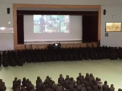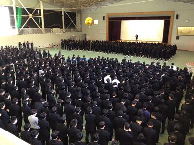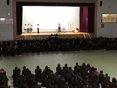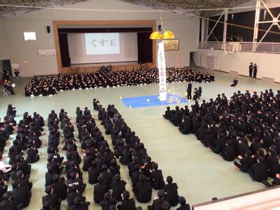 4月9日(木)、対面式を行いました。本校体育館に900名を超える全校生徒が集まり、県工名物「くす玉」割りから対面式はスタートしました。生徒会役員の進行のもとで、2・3年生が工夫を凝らした「学科紹介」「部活動紹介」「委員会紹介」などを行い、新入生の入学を祝いました。