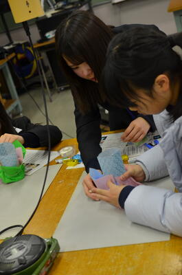 電気科の実習室を会場に行った「カラフルライトつくり」では、電気科及び電子機械科の生徒7名が講師となって、参加した子どもたちはペットボトルなどの素材を材料にナイトライトつくりに挑戦しました。子どもたちは、ハサミやグルーガンを器用に使って、世界に一つだけのライトを完成させました。夜に自宅で灯すのがとても楽しみですね。