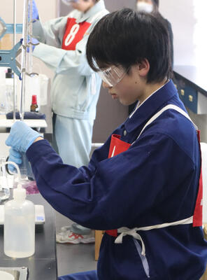 化学分析部門の課題は、「キレート滴定法により飲料水のCa及びMgの定量を行うことにより飲料水の各硬度を求め、測定結果報告書を提出する」という内容です。競技は制限時間2時間30分で行われ、高い専門知識と正確な分析技術とともに作業の効率性や分析結果の正確な計算能力が要求されます。二人は化学工業科の授業での学びをもとに放課後の練習に意欲的に取り組むことで、このようなすばらしい結果につなげることができました。大変おつかれさまでした。今後も二人が更なる専門知識の深化と技能向上に励まれることに期待しています。