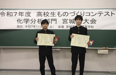 10月31日(金)と11月1日(土)の2日間、本校を会場に開催された令和7年度「高校生ものづくりコンテスト」宮城県大会化学分析部門に、本校から化学工業科2年生の生徒2名が出場しました。その結果、関 太星さんが第2位、松崎 望央さんが第3位に入賞するというすばらしい結果を収めることができました。おめでとうございます!