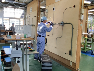 電気工事部門は、1820 × 1820mm(床上 300mm)の垂直パネルに、「競技規則」に従い、「施工図」及び「施工条件」に示す配線工事を行う競技です。今回出場した2名は、電気科の授業での学びをもとに、朝練習や放課後および休日の練習に意欲的に取り組み、本大会で競技課題を完成させるとともにすばらしい結果をつかみ取ることができました。大変おつかれさまでした。お二人の今後ますますの技能向上とともに、小池さんの来年度の東北大会における活躍を祈念しております。